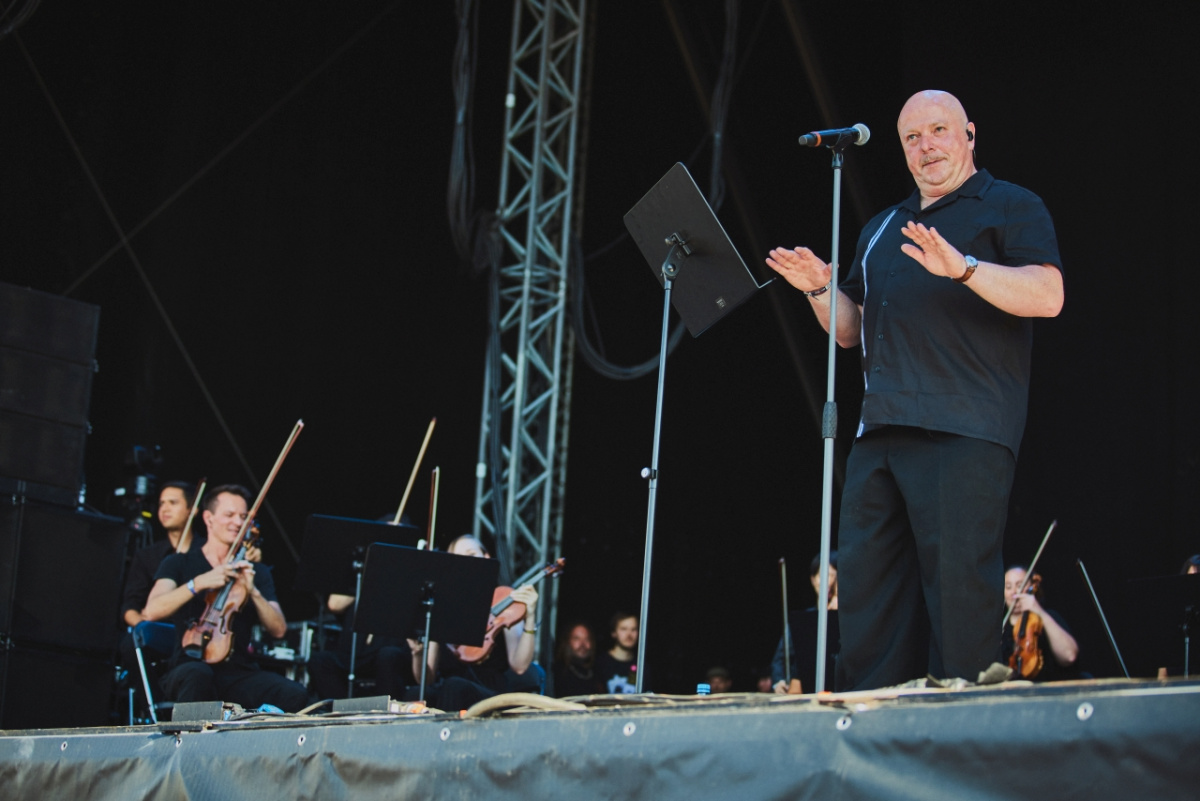 Ze zvědavosti jdeme omrknout hlavní pec… totiž stage. A zjišťujeme jsme, že pořadatelé M’Era Luny nekecají. Když totiž ohlásí vystoupení „VNV Nation – klasik“, myslí to doslova. Tedy Ronan Harris, doprovázený klasickým smyčcovým tělesem. Ovšem jedním dechem je dlužno dodat, že pokud někdo vládne dostatečně mocným hlasem na to, aby utáhnul smyčcové těleso, je to právě tenhle podsaditý Irčan. Zase totiž zpíval skvěle, i když v přímém slunci a nasvícený červeným světlem vypadal chudák jako rak, vytažený z hrnce vařící vody (a moc bych za to nedal, že se tak cítil). Právě čas a místo tomuhle jinak pěknému počinu podkopával nohy. Tenhle set by totiž fantasticky vyzněl třeba na sezení v divadle, se světly. Takový ten fakt hezký večerní event, na který se pěkně obléknete, dáte si k tomu lahvinku dobrého vína a necháte se pohltit hudbou. Odpoledne za přímého slunce to ale prostě tolik nemaká. Chybí-li beaty, je to samozřejmě menší party a navíc tím pádem Ronan nemohl běhat ze strany na stranu a řvát: „Loudeeeer“, aby dav vyhecoval k činnosti.